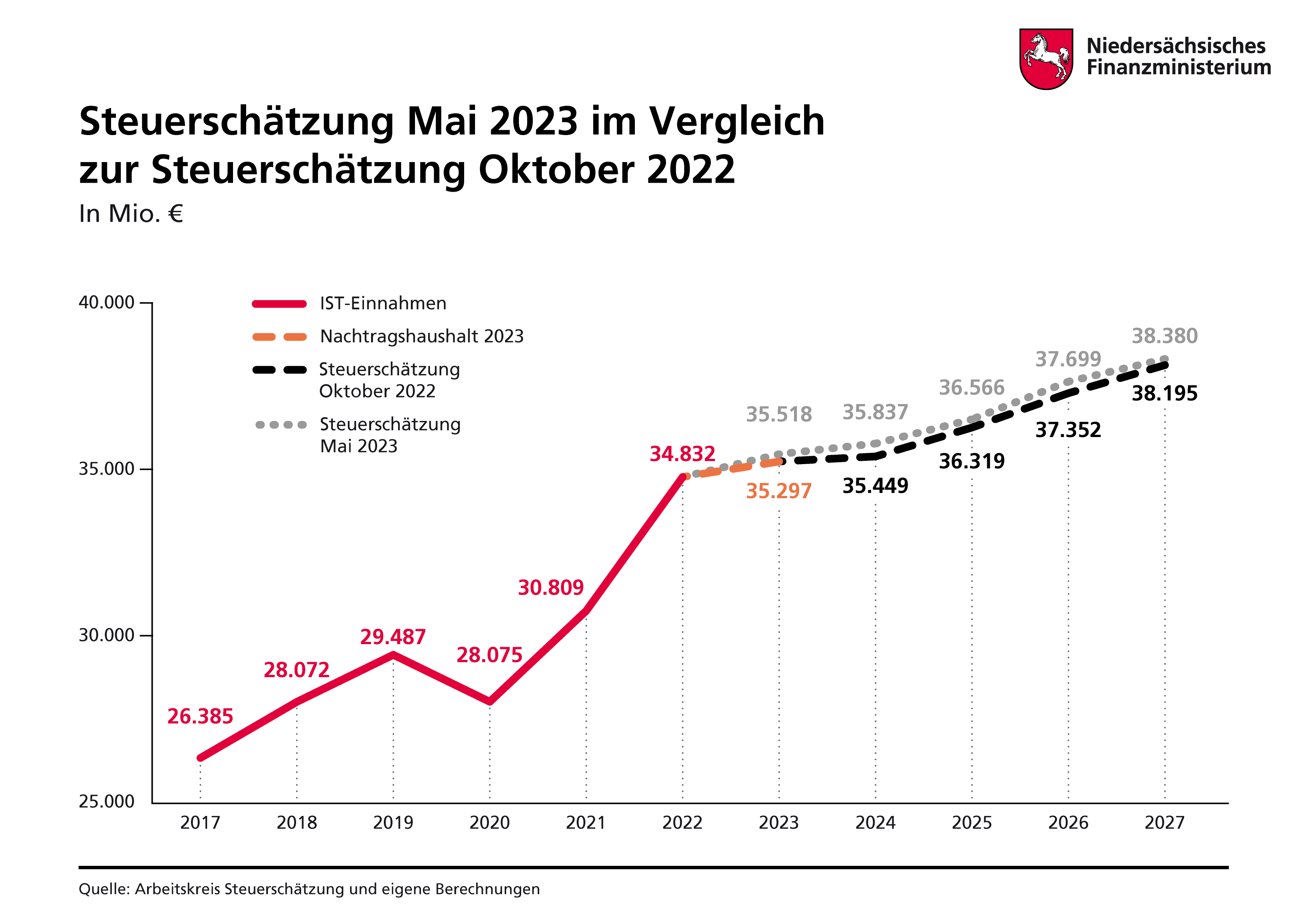 Der Landeshaushalt kann nach dieser Schätzung 2023 mit insgesamt rund 35,5 Milliarden Euro, 2024 mit rund 35,8 Milliarden Euro, 2025 mit 36,6 Milliarden Euro, 2026 mit 37,7 Milliarden Euro und 2027 mit 38,4 Milliarden Euro an Steuereinnahmen rechnen.