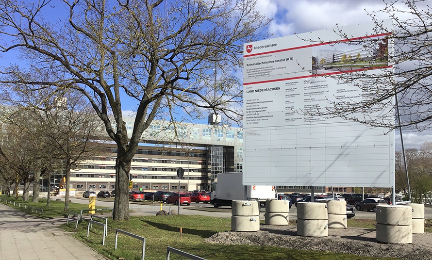Hannover. Mit dem Aufstellen des Bauschilds wird der Fortschritt der Baustelle für den Neubau des Kriminaltechnischen Instituts (KTI) südlich des Behördenhauses der ehemaligen Bezirksregierung am Waterlooplatz sichtbar.