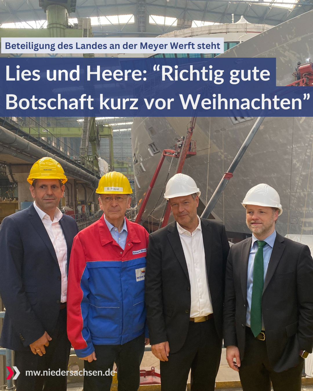 Die Meyer Werft steht auf einer soliden Grundlage: eine exzellente Auftragslage und Innovationsstärke im Schiffbau. Jetzt gilt es, gemeinsam mit den Beschäftigten, der Gewerkschaft und den neuen Strukturen im Aufsichtsrat die Werft nachhaltig und zukunftsfest aufzustellen.