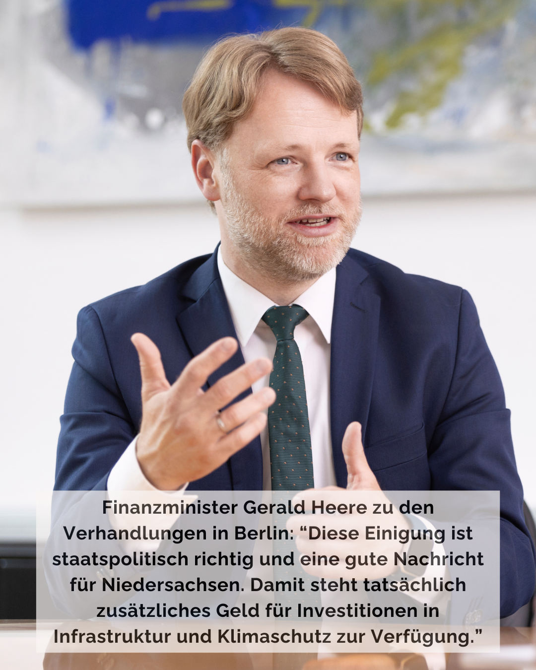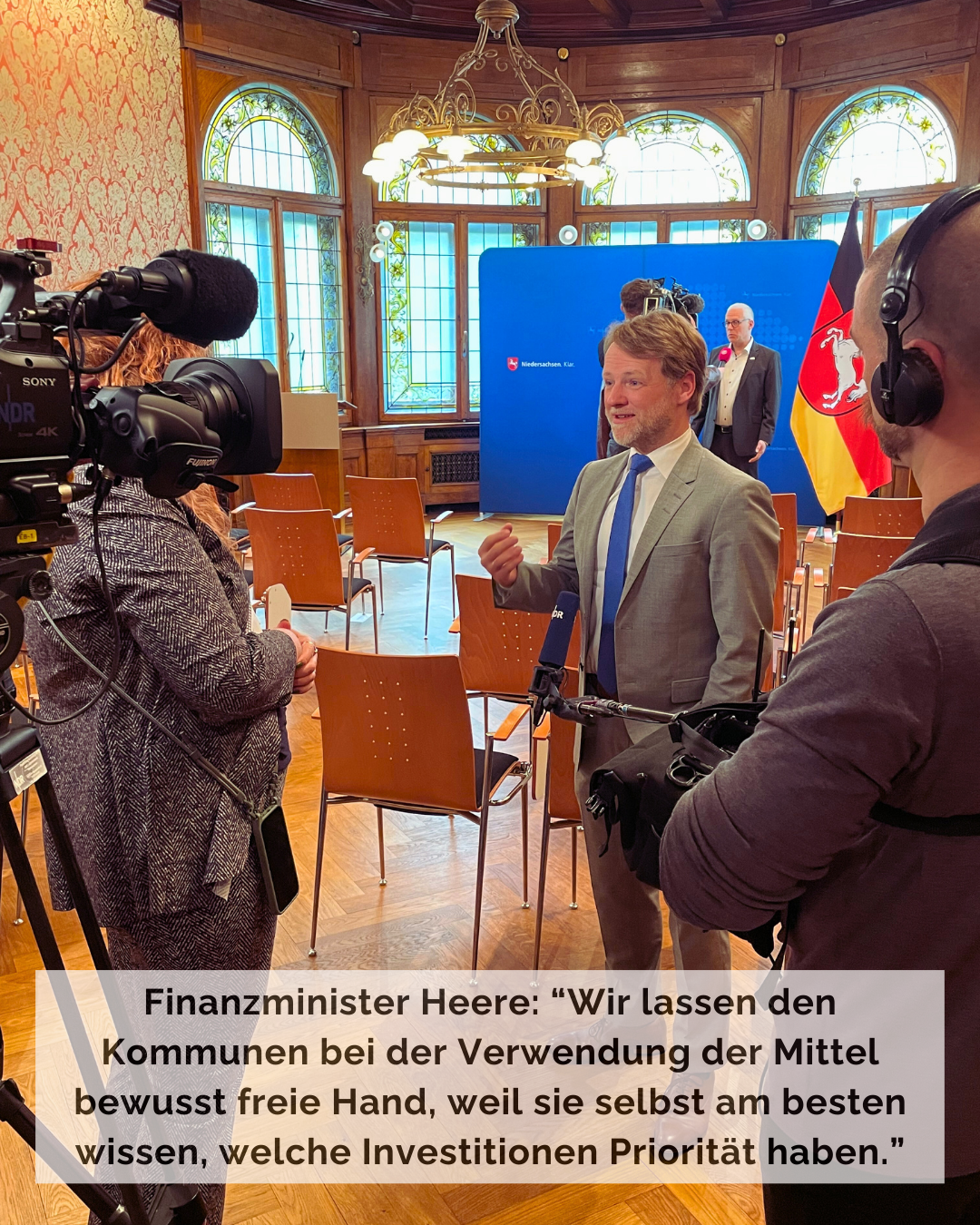 Finanzminister Heere: „Wir müssen das zusätzliche Geld sinnvoll einsetzen, damit es einen langfristigen, nachhaltigen Nutzen hat. In den Vordergrund gehören Maßnahmen zur Digitalisierung, die Sanierung unserer Verkehrswege, mehr Klimaschutz, und eine bessere Bildungsinfrastruktur.“