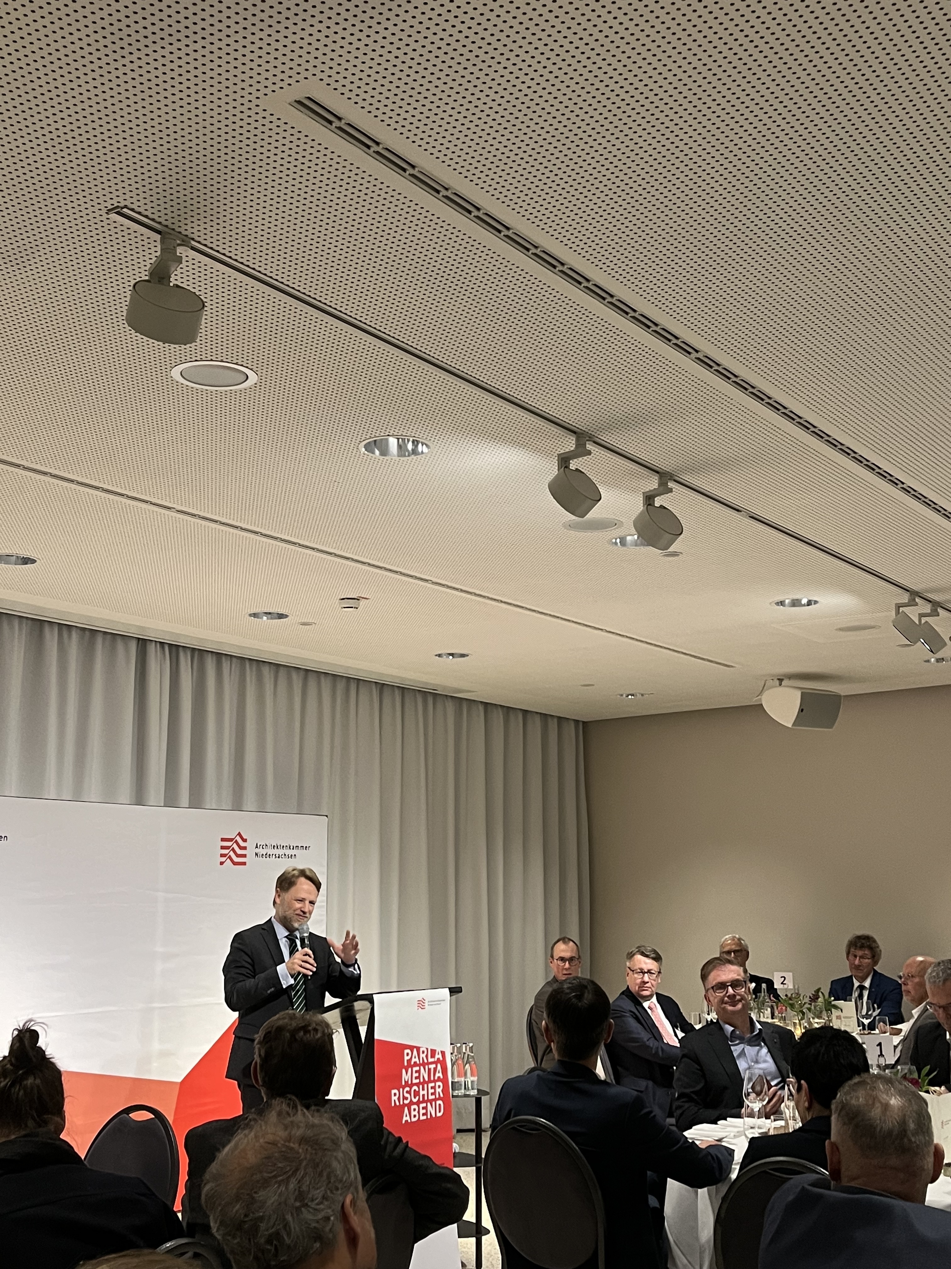 7.11.2024: Am Donnerstag war Finanzminister Gerald Heere beim Parlamentarischen Abend der Architektenkammer Niedersachsen zu Gast. Er bedankte sich für den unermüdlichen Einsatz aller Architektinnen und Architekten als wichtige Partner beim Bemühen um mehr Klimaschutz und Energieeffizienz.