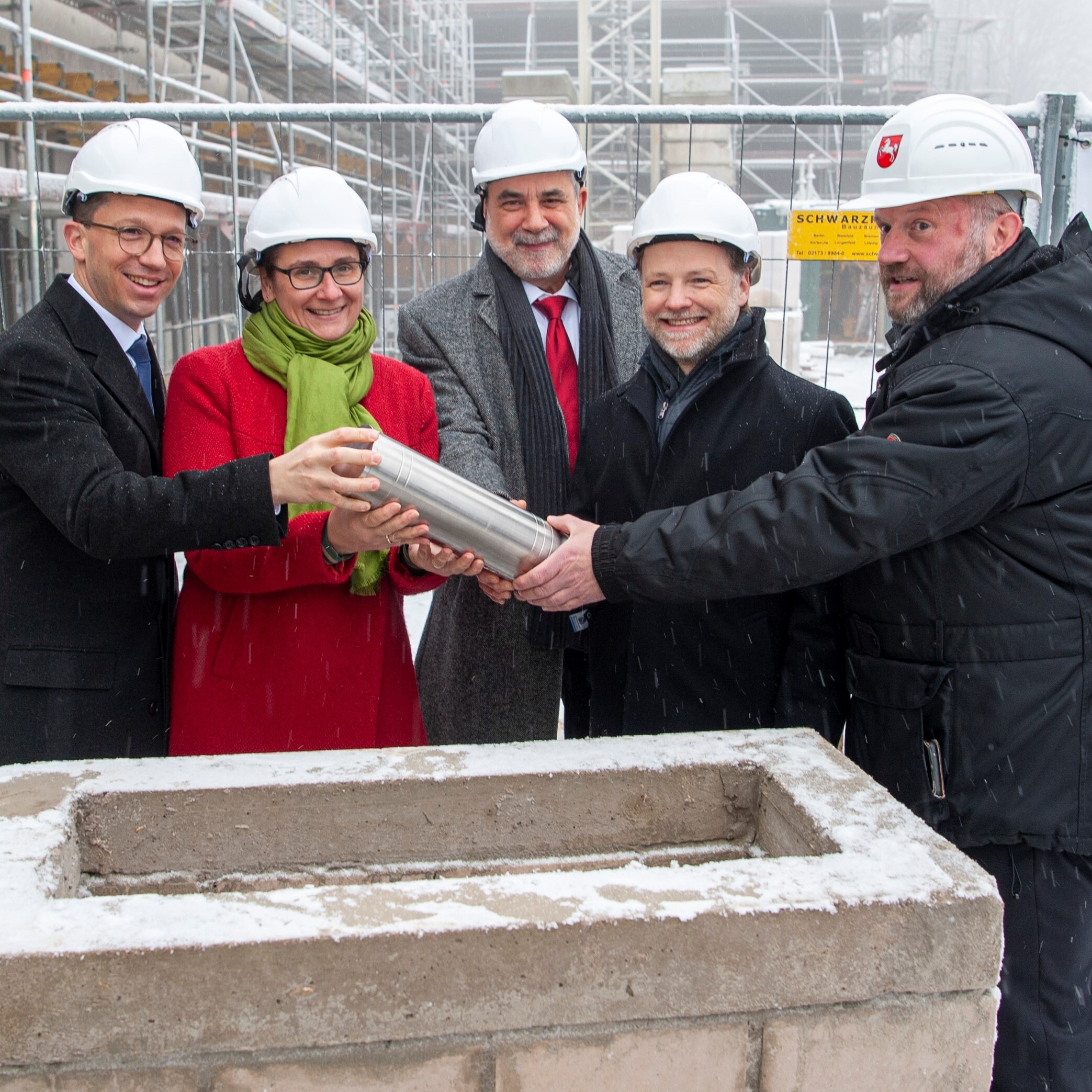 20.11.2024: Der Minister für Wissenschaft und Kultur Falko Mohrs und Finanzminister Gerald Heere haben heute den Grundstein für die größte Baumaßnahme der TU Clausthal seit Jahrzehnten gelegt. Im Chemie Campus Clausthal werden in Zukunft alle chemischen Institute der Technischen Universität zusammengeführt. Das Fundament für den Chemie Campus ist bereits mitten im Zentrum der Universität gelegt. Gemeinsam mit der Clausthaler Universitätspräsidentin Dr.-Ing. Sylvia Schattauer und dem Leiter des Staatlichen Baumanagements Südniedersachsen Marcus Rogge wurde nun der Grundstein für den erste Bauabschnitt gelegt, der den Neubau eines Praktikumsgebäudes und die Sanierung des Horst-Luther-Hörsaalgebäudes umfasst. Rund 38 Millionen Euro werden dafür investiert.