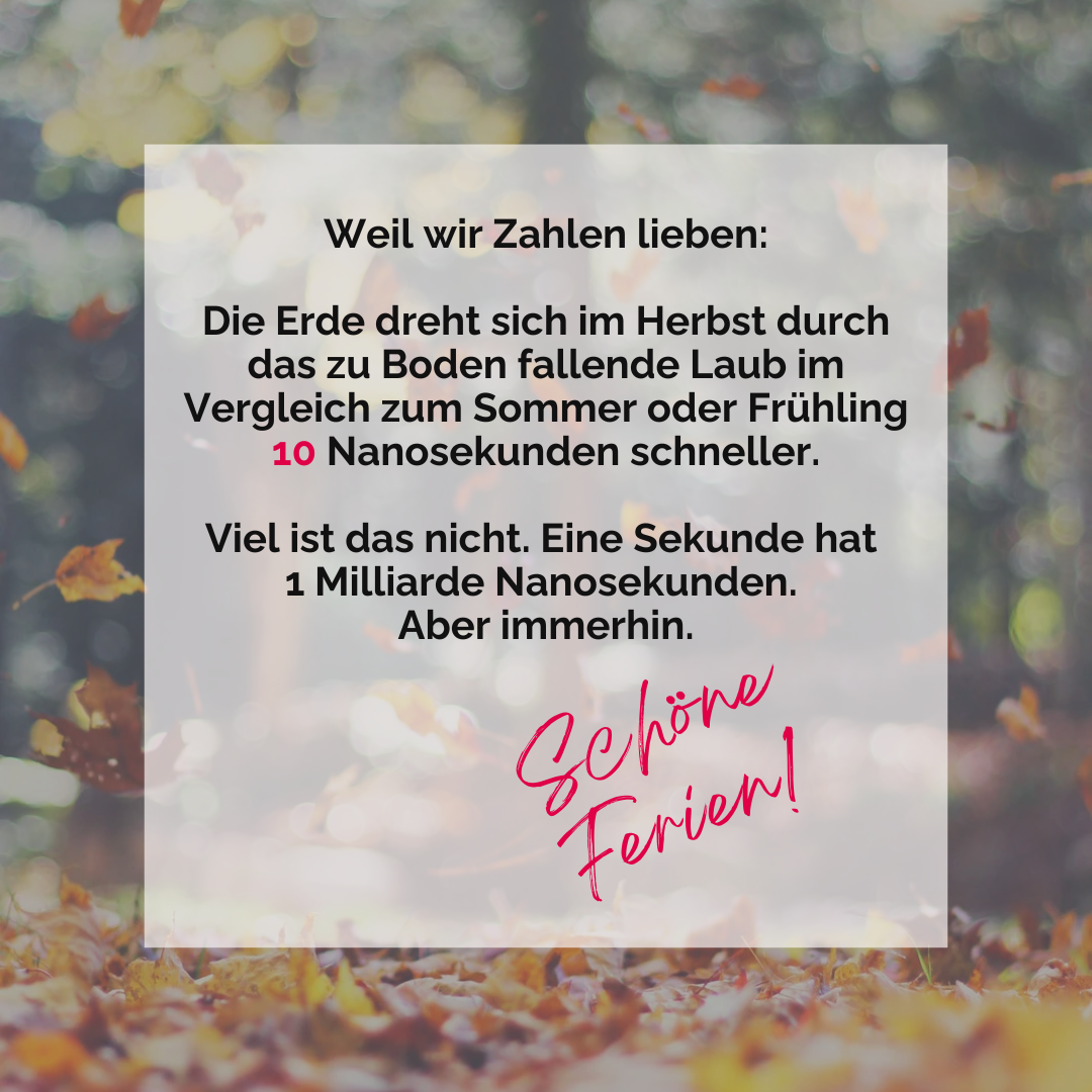 4.10.2024: Weil wir Zahlen lieben: Die Erde dreht sich im Herbst durch das zu Boden fallende Laub im Vergleich zum Sommer oder Frühling 10 Nanosekunden schneller.