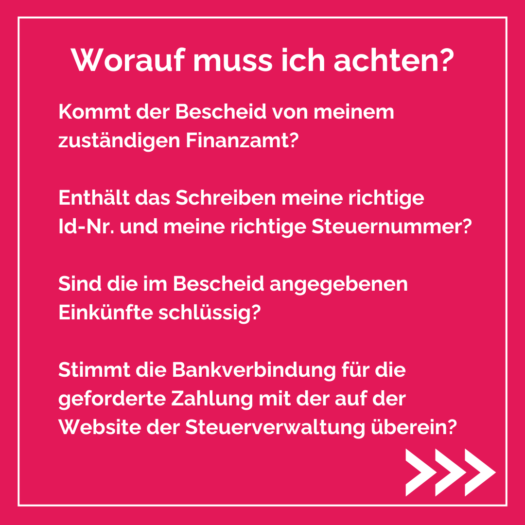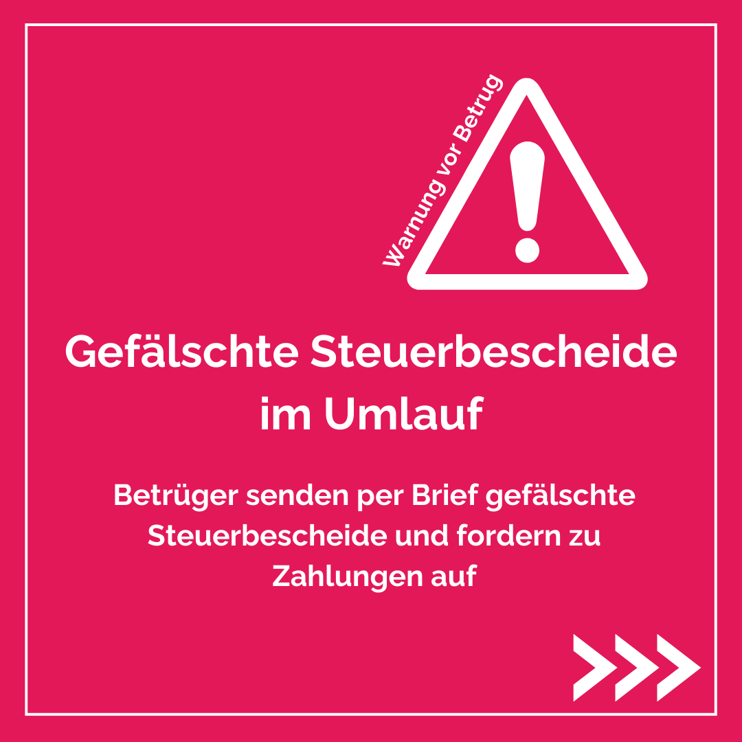 Weitere Informationen zu dieser Betrugsmasche findet ihr auch in einer Meldung des Landeskriminalamts Niedersachsen: https://www.polizei-praevention.de/aktuelles/gefaelschter-steuerbescheid-per-briefpost.html