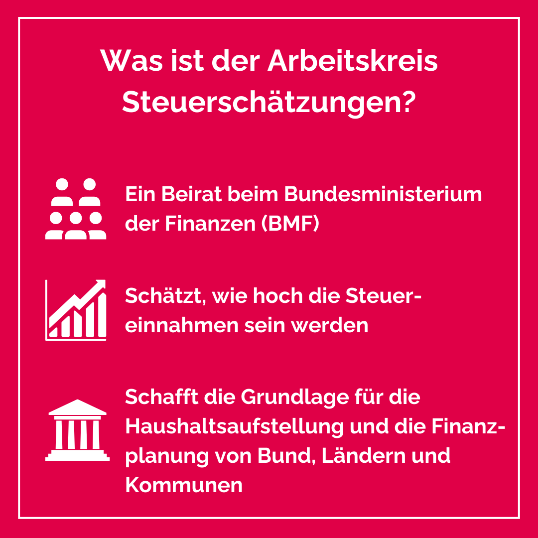 22.10.2024: Der Arbeitskreis Steuerschätzungen ist ein Beirat beim Bundesministerium der Finanzen. Ihm gehören neben dem federführenden Bundesfinanzministerium, das Bundesministerium für Wirtschaft und Klimaschutz, fünf Wirtschaftsforschungsinstitute, das Statistische Bundesamt, die Deutsche Bundesbank, der Sachverständigenrat zur Begutachtung der gesamtwirtschaftlichen Entwicklung, die Länderfinanzministerien und die Bundesvereinigung kommunaler Spitzenverbände an.