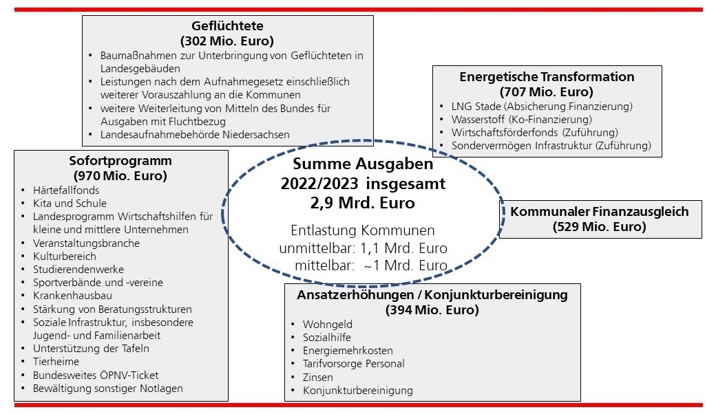 Das Sofortprogramm in Höhe von 970 Millionen Euro umfasst einen Härtefallfonds mit einem Volumen von 55 Millionen Euro, der Strom- oder Gassperren bei Bürgerinnen und Bürgern verhindern soll, die besonders hart getroffen sind. Vorgesehen sind auch 200 Millionen Euro für Kitas und Schulen, 200 Millionen Euro für kleine und mittlere Unternehmen sowie 50 Millionen Euro für die Veranstaltungsbranche und 27 Millionen Euro für den Kulturbereich. Je 30 Millionen Euro gehen an die Studierendenwerke und die Sportvereine. Beratungsstrukturen und soziale Einrichtungen werden zusammen mit 63 Millionen Euro unterstützt. Bei den Tafeln wird der Aufbau von Verteilzentren mit 2 Millionen Euro gefördert und Mehrbelastungen bei Tierheimen mit 1 Millionen Euro abgefedert. 160 Millionen Euro sind vorgesehen für den Finanzierungsanteil des bundesweiten 49-Euro Tickets.