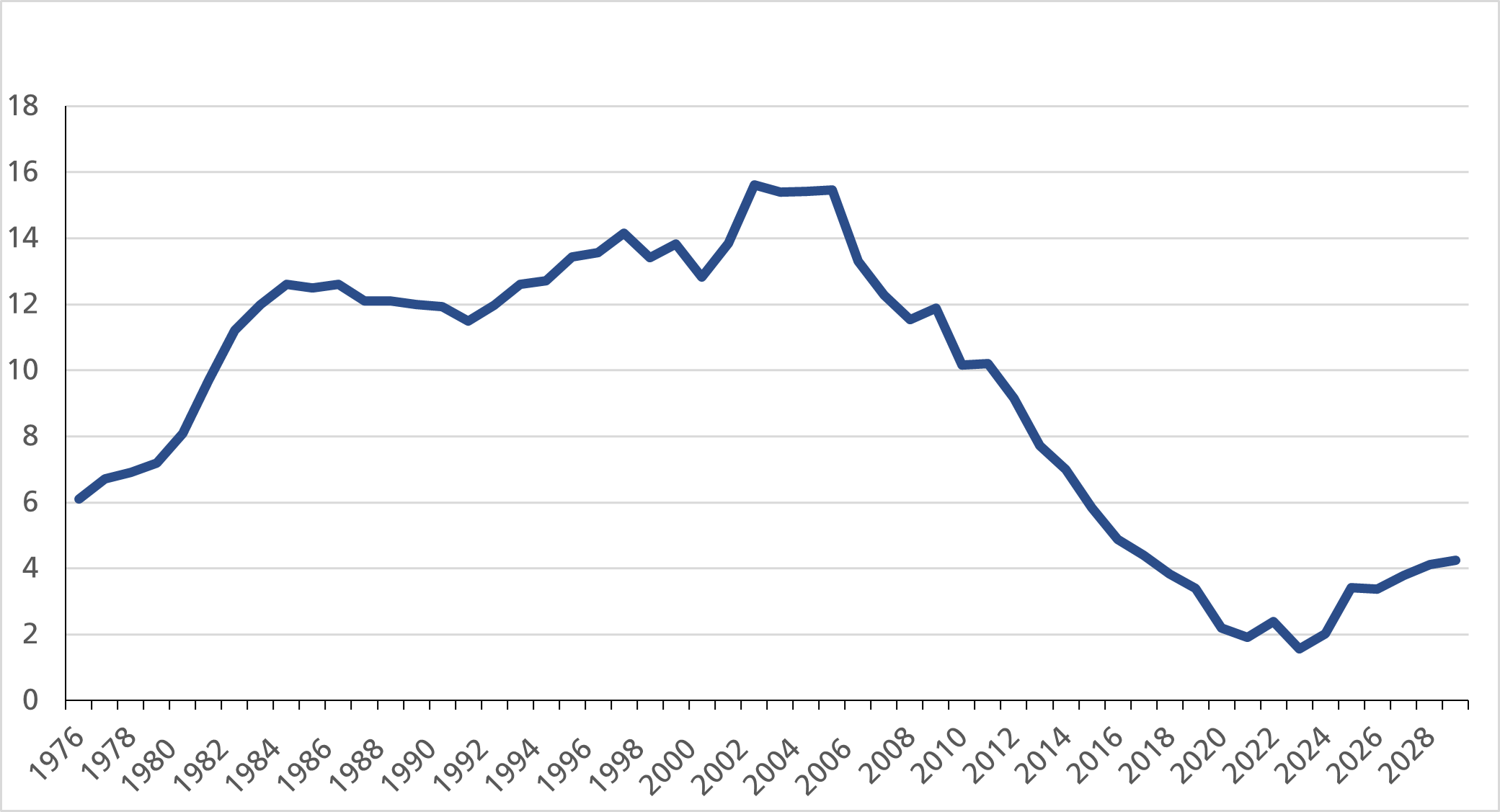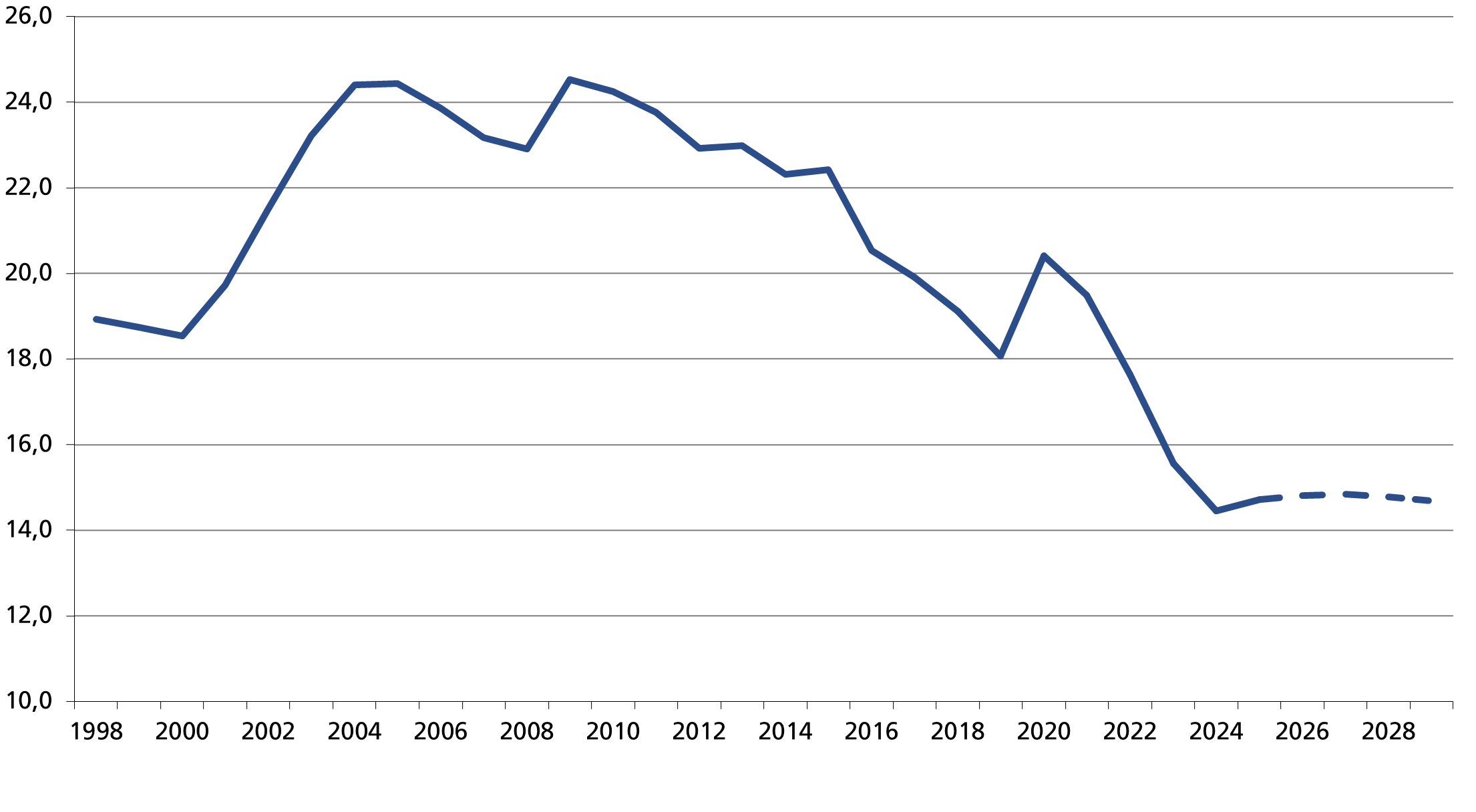 Anfang der Nuller-Jahre bewegte sich diese auf einem hohen Niveau. Mehr als 15 Prozent der Einnahmen des Staates waren zeitweise für die Finanzierung von Schulden gebunden. Sie konnte ab 2006 aber deutlich reduziert werden auf zuletzt 3,6 Prozent im Jahr 2024. In den kommenden Jahren wird sie nach aktuellen Prognosen voraussichtlich wieder leicht auf über 4 Prozent ansteigen, sich damit aber weiterhin auf einem niedrigen Niveau bewegen.